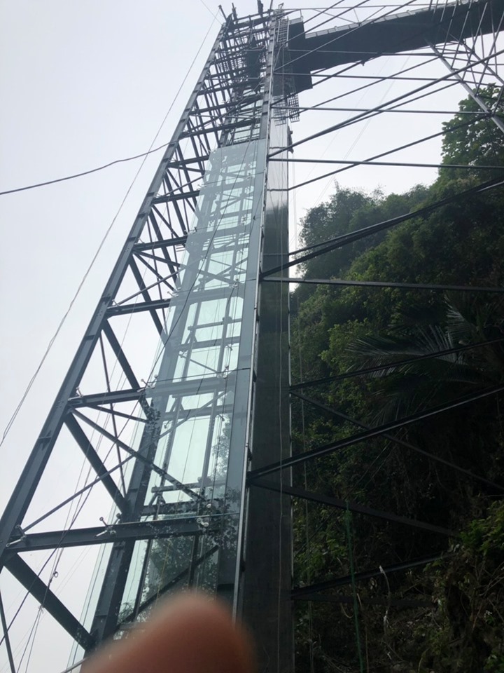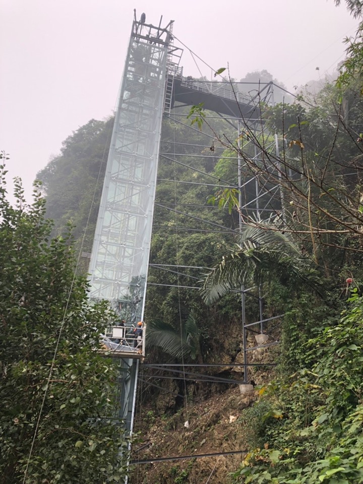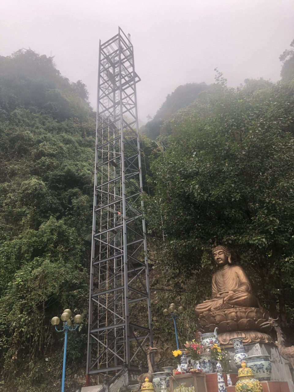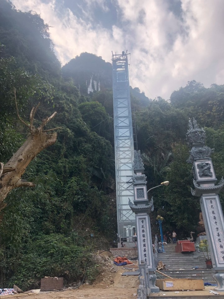 Chưa đầy 3 tháng kể từ khi ký kết hợp đồng công trình vận hành thang máy khu du lịch Đền Bồng Lai, Cao Phong, Hòa Bình đã được hoàn thiện và đi vào hoạt động. Với yêu cầu tiến độ khắt khe và gấp rút từ phía khách hàng, đối diện với rất nhiều khó khăn từ vị trí lắp đặt, địa hình và kết cấu phức tạp. Công trình thang máy lồng kính được thi công với tổng chiều cao 50m, kết cấu kính cường lực 4 mặt kết hợp hệ thống khung thép vững chắc, cần có sự kết hợp kỹ thuật giữa các khâu vô cùng phức tạp, đảm bảo cho thang máy vận hành an toàn giữa không gian không hề có điểm tựa hay tường gạch.